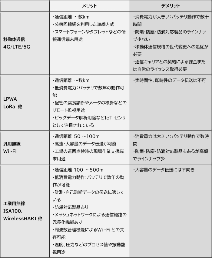 LPWAは、低消費電力で長距離伝送を特徴としている。一方で、データ伝送の即時性の観点からは、他の無線技術に劣る。そのため、配管の腐食診断やメータの検針など、通信速度や遅延の要件が厳しくない工場設備の状態のリモート監視などの用途に向いている。最近では、工場設備の状態をビッグデータ解析するためのIIoTセンサの無線方式として注目されている。